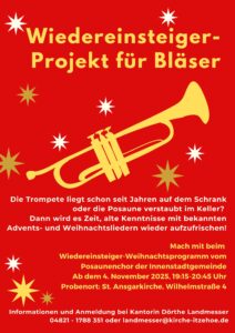 Die Trompete liegt schon seit Jahren auf dem Schrank oder die Posaune verstaubt im Keller? Mit Beginn der dunklen Jahreszeit besteht nun die perfekte Gelegenheit, alte Kenntnisse mit bekannten Advents- und Weihnachtsliedern wieder aufzufrischen – und somit auch zugleich das Repertoire für das Musizieren unterm häuslichen Tannenbaum zu erweitern. Daher lädt der Posaunenchor der Innenstadtgemeinde alle musizierbegeisterten Blechbläser dazu ein, beim Weihnachtsprogramm für Wiedereinsteiger mitzumachen.